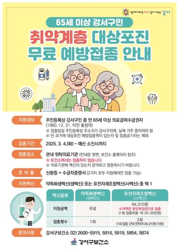 서울 강서구(구청장 진교훈)는 지역 내 65세 이상 어르신을 대상으로 대상포진 무료 예방접종을 시행한다.