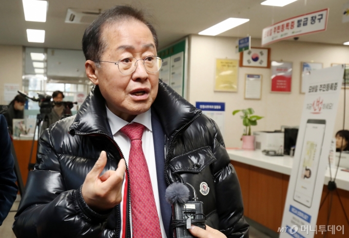 홍준표 대구시장이 14일 오전 대구 남구 봉덕2동 행정복지센터에서 모바일 주민등록증 발급을 마친 뒤 경남지사 선거를 비롯한 선거비용 초과 사용 여부를 묻는 취재진 질문에 답하고 있다. 2025.2.14/사진=뉴스1 /사진=(대구=뉴스1) 공정식 기자 |