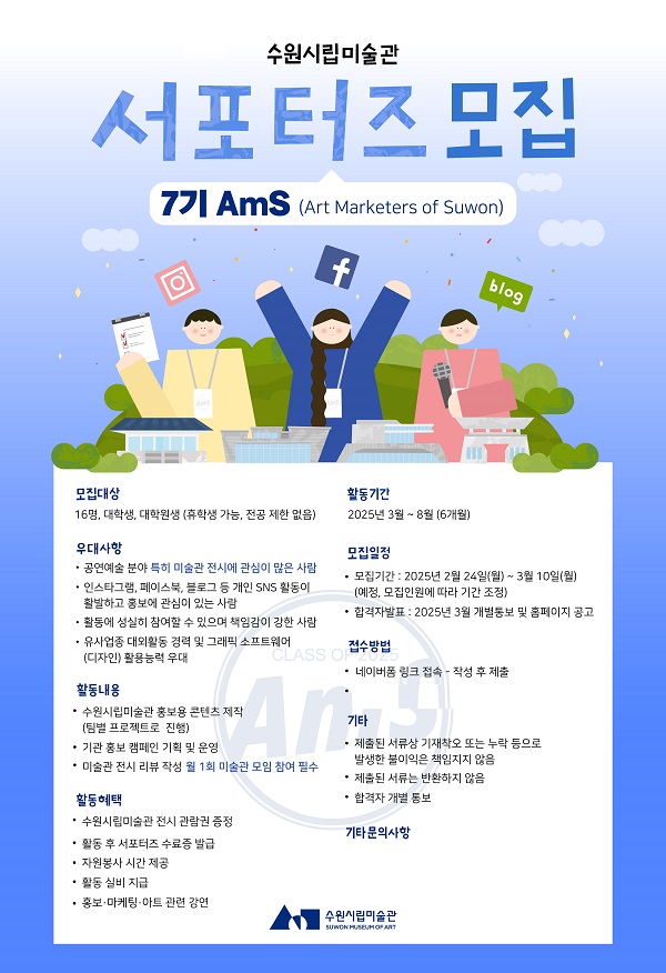 (문화뉴스 강민진 기자) 수원시립미술관이 전시 체험과 마케팅 활동을 담당할 제7기 서포터즈 'AmS(Art Marketers of Suwon)'를 다음달 10일까지 모집한다고 밝혔다.