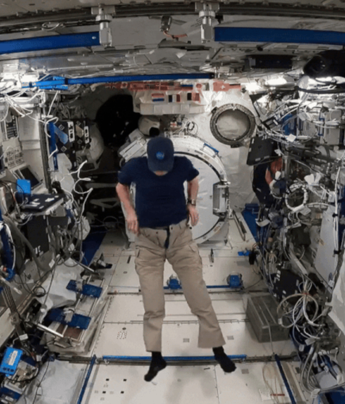 그는 바지를 손으로 잡지 않고 입는 모습도 선보였다. 두 번째 영상에서 그는 미세 중력하에서 바지 위로 미끄러듯 낙하하며 바지를 입을 수 있었다.