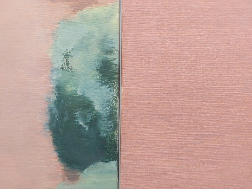 특히 열대 삼림을 표현한 것으로 보이는 들머리의 ‘히우그란지두술’(Rio Grande do sul, 2023)은 18세기 겸재 정선의 기운생동한 관동 풍경인 ‘통천문암’의 울렁거리는 물살의 파장을 연상하게 한다. 화면을 좌우로 나눠 왼쪽은 열대림의 심연을 명암의 대조가 뚜렷한 강렬한 붓놀림으로 처리하고, 오른쪽은 살굿빛을 띤 열대 기후 혹은 토양과 대기의 추상적 이미지를 미묘한 굴곡을 이루며 울렁거리는 색면의 흐름으로 나타냈다. 물가 새들의 밝은 빛깔과 대조를 이루는 땅과 하늘의 짙고 거친 색감을 역시 강하게 휘젓는 붓질의 연속적인 흔적들로 표현한 ‘저기, 일상’ 연작(2024)이나 질질 흘러내리는 물감층과 붓질의 흔적이 어우러진 숲의 이미지를 보여주는 ‘낯설게 마주한 익숙한 풍경’(2024)도 강렬한 인상으로 남는다.