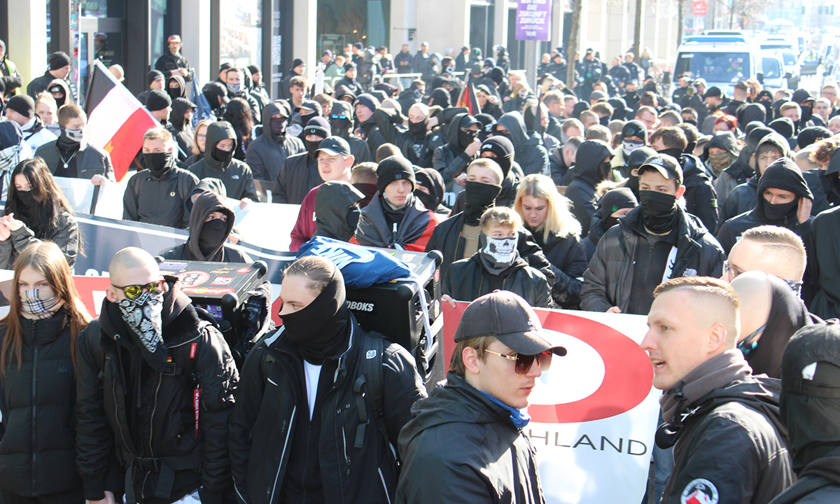 독일 연방의회 총선을 하루 앞둔 지난 22일(현지시간) 독일 베를린 프리드리히슈트라세 기차역 광장에 극우정당 지지자들이 집회를 하고 있다. 연합뉴스 |