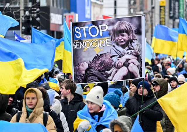 우크라이나 전쟁이 발발한 지 3년을 하루 앞둔 23일 캐나다 몬트리올에서 러시아 규탄 및 우크라이나를 지지하는 집회가 열리고 있다. 휴일인 이날 파리, 런던, 브뤼셀, 프라하 등 유럽 주요 도시 곳곳에서 우크라이나를 지지하는 시위가 열렸다. 몬트리올=AP 연합뉴스 |