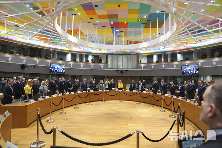 [AP/뉴시스] 24일 유럽연합 외무장관들이 브뤼셀 정상회의본부에서 회동하면서 우크라 침공 3주년을 생각하는 1분 묵념을 하고 있다 |