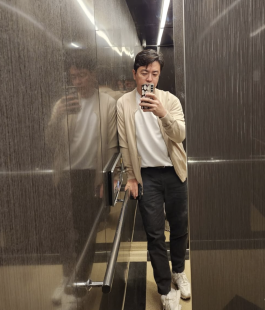 함께 공개한 사진 속에는 건물 안에서 셀카 촬영 중인 최동석의 모습이 담겨 있다.