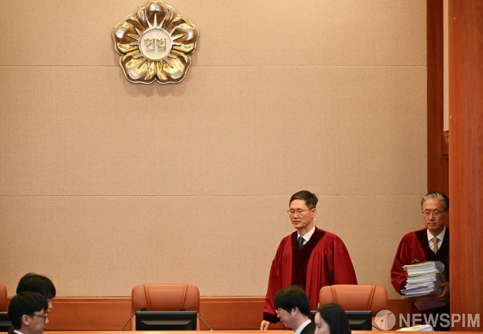 [서울=뉴스핌] 사진공동취재단 = 문형배 헌법재판소장 직무대행과 김형두 헌법재판관이 25일 서울 종로구 헌법재판소 대심판정에서 열린 윤석열 대통령 탄핵심판 최종 변론에 입장하고 있다. 2025.02.25 photo@newspim.com