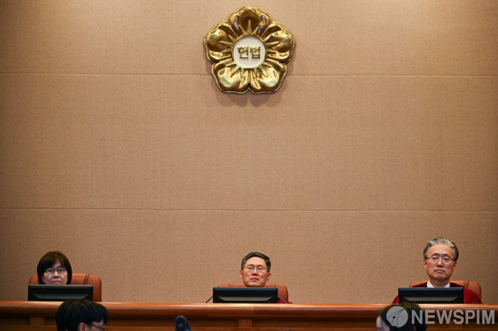 [서울=뉴스핌] 사진공동취재단 = 이미선 헌법재판관(왼쪽부터), 문형배 헌법재판소장 직무대행, 김형두 헌법재판관이 25일 서울 종로구 헌법재판소 대심판정에서 열린 윤석열 대통령 탄핵심판 최종 변론에 입장해 재판을 기다리고 있다. 2025.02.25 photo@newspim.com