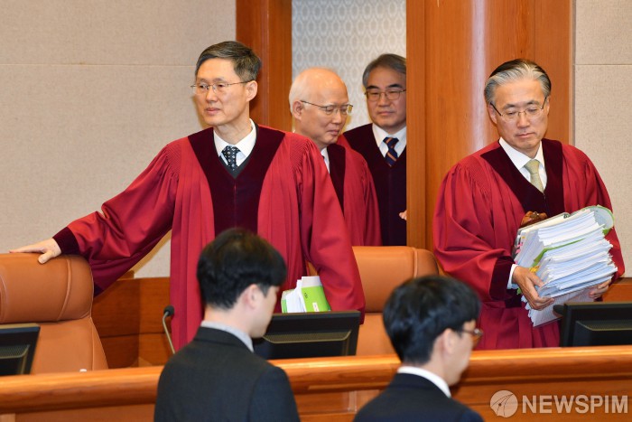 [서울=뉴스핌] 사진공동취재단 = 문형배 헌법재판소장 권한대행을 비롯한 재판관들이 25일 서울 종로구 헌법재판소에서 열린 윤석열 대통령 탄핵심판 마지막 변론기일에 참석하고 있다. 2025.02.25 photo@newspim.com