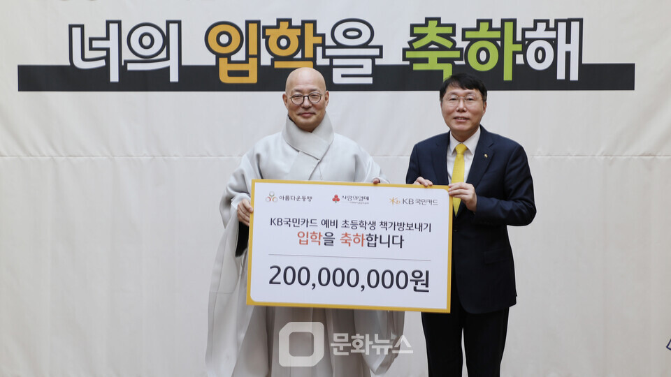 20일 서울 종로구 한국불교역사문화기념관에서 열린 'KB국민카드 예비초등학생 책가방 보내기' 기부금 전달식에서 김재관 KB국민카드 사장(오른쪽)이 아름다운동행 이사장 진우스님과 기념사진을 촬영하고 있다. / 사진제공=KB국민카드 |