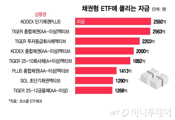 이외에도 TIGER 종합채권(AA-이상)액티브(2563억원), TIGER 투자등급회사채액티브(2203억원), KODEX 종합채권(AA-이상)액티브(2000억원), TIGER 25-10 회사채(A+이상)액티브(1882억원), PLUS 종합채권(AA-이상)액티브(1413억원), SOL 초단기채권액티브(1290억원), TIGER 25-12 금융채(AA-이상)(1268억원) 등으로 집계됐다.