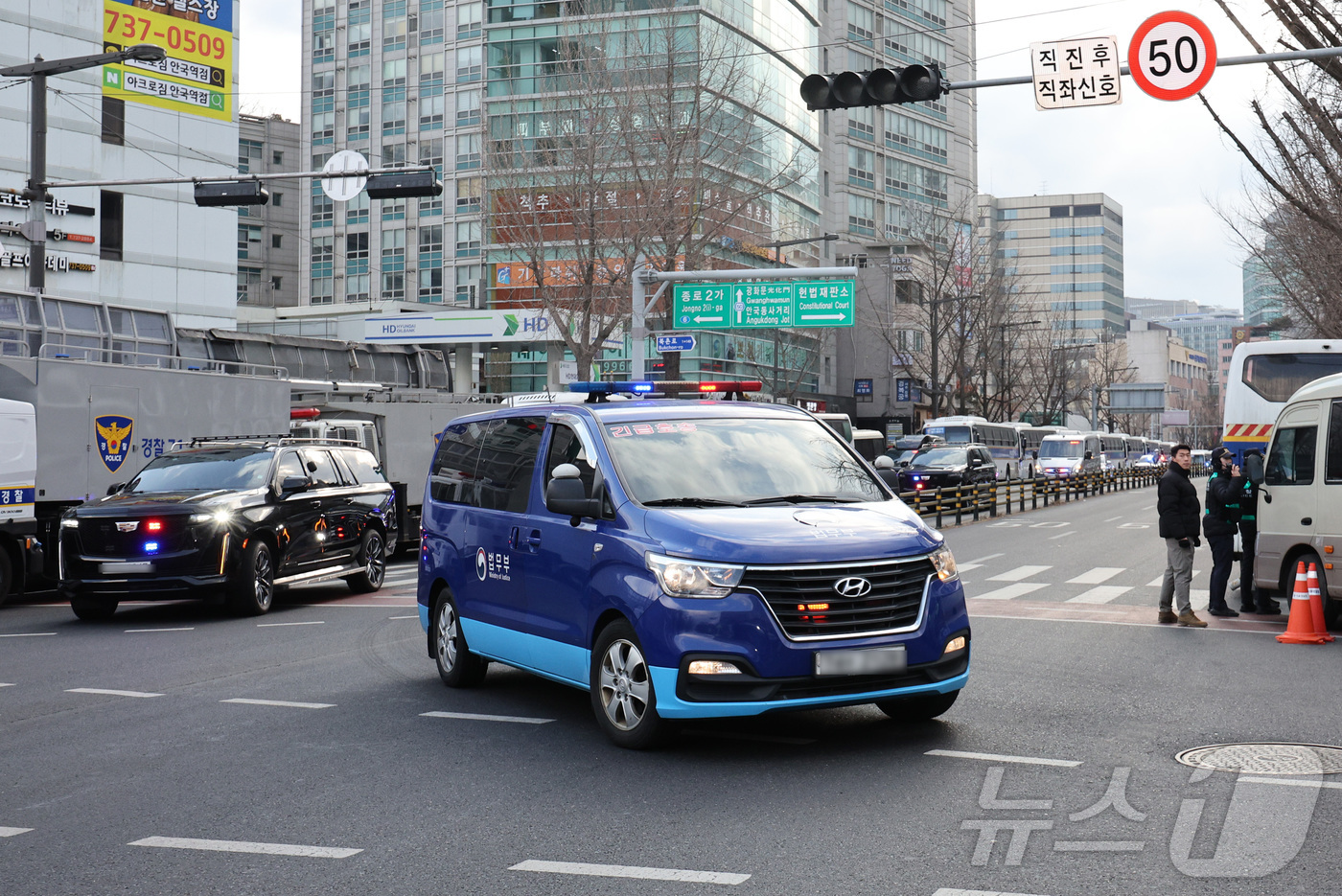 (서울=뉴스1) 신웅수 기자 = 윤석열 대통령 탄핵 심판 마지막 변론 기일인 25일 오후 서울 종로구 헌법재판소 인근 안국역 사거리에서 윤 대통령이 탄 법무부 호송 차량이 경호를 받으며 헌법재판소로 향하고 있다. 이날 변론기일에는 윤 대통령이 헌정사 최초로 탄핵 심판 최후 진술을 할 것으로 알려졌다. 2025.2.25/뉴스1