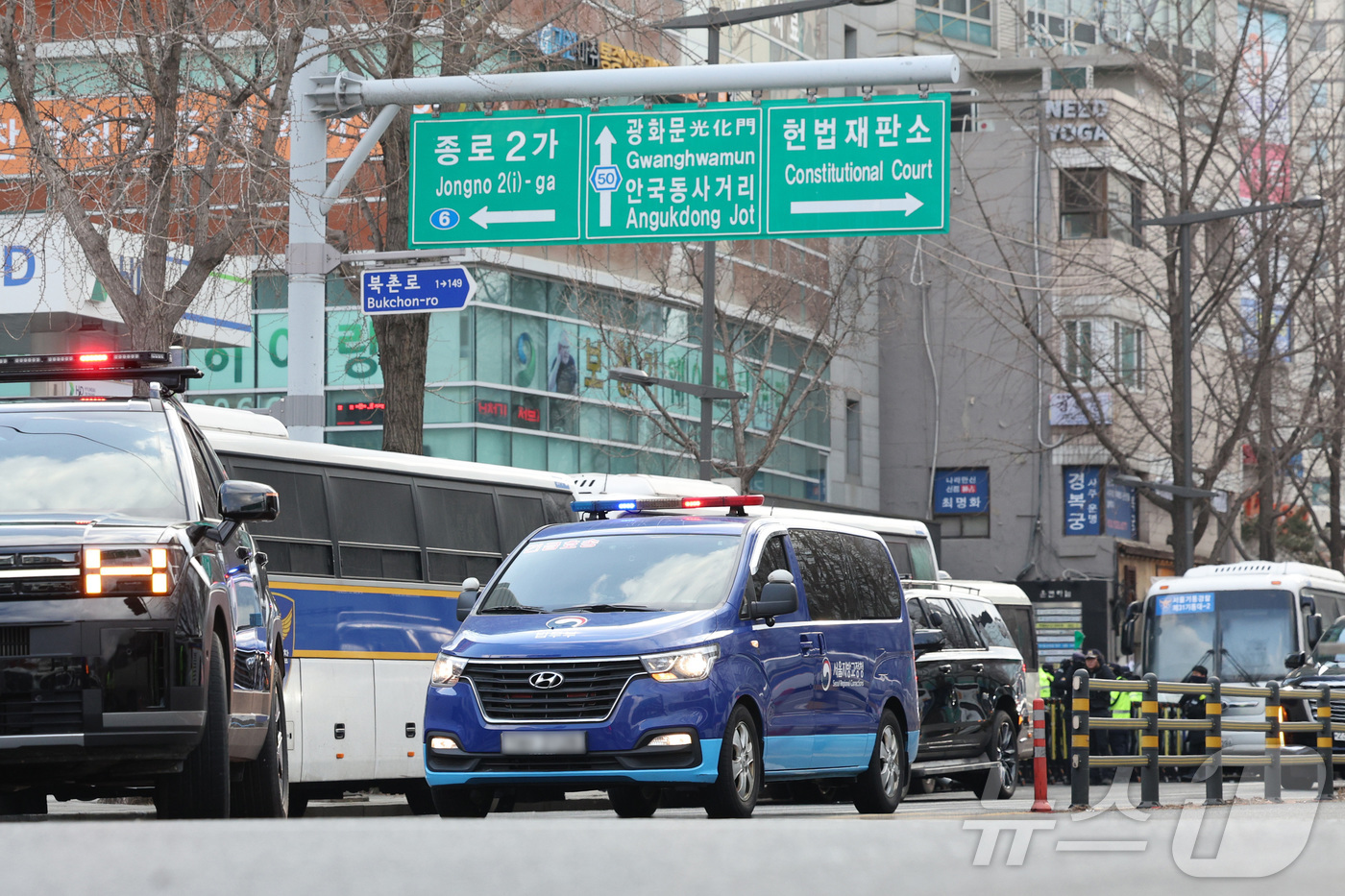 (서울=뉴스1) 신웅수 기자 = 윤석열 대통령 탄핵 심판 마지막 변론 기일인 25일 오후 서울 종로구 헌법재판소 인근 안국역 사거리에서 윤 대통령이 탄 법무부 호송 차량이 경호를 받으며 헌법재판소로 향하고 있다. 이날 변론기일에는 윤 대통령이 헌정사 최초로 탄핵 심판 최후 진술을 할 것으로 알려졌다. 2025.2.25/뉴스1