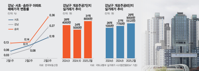 25일 국토교통부 실거래가 자료에 따르면 강남구 개포동 개포주공7단지 전용 83㎡는 설 연휴 직후였던 이달 3일 직전 최고가 보다 3억 원 오른 31억 8000만 원에 계약됐다. 단지 인근 개포동 A중개업소 대표는 “토허제가 해제되면 개포동 아파트 가격도 상승 흐름을 탈 것이란 기대감에 지난달부터 매수 문의가 들끓었다”며 “토허제 규제가 없을뿐더러 재건축 속도가 빨라 단순히 호가만 높아진 게 아니라 거래가 활발하게 이뤄져 지난주에만 개포 주공 단지에서 15건의 계약이 성사됐다”고 전했다. 개포주공5단지는 3월에 조합원들의 주택형 신청이 예정돼있다. 또 6·7단지는 4월에 시공사를 선정할 계획이다.