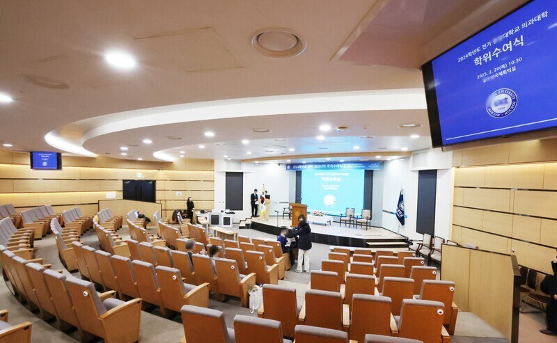 지난 20일 서울 한 의과대학 졸업식에서 참석자들이 대기하고 있다. 이날 졸업식에는 극소수의 졸업생만 참석했다. 한편 의대생 집단 휴학으로 졸업생을 배출하지 못한 의대에서는 전기 학위수여식을 취소하고 있다. 연합뉴스 |