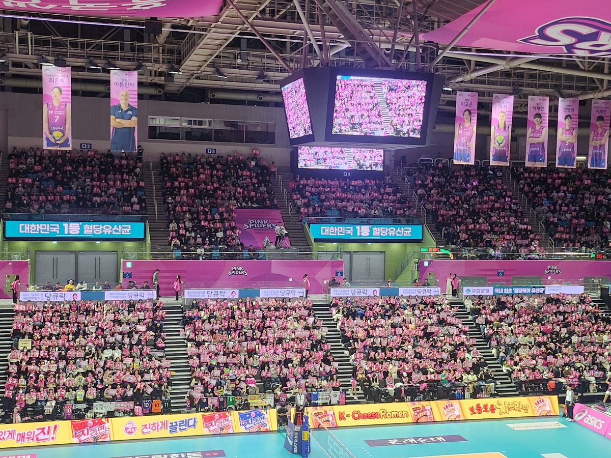 평일임에도 흥국생명의 홈 경기장인 인천 삼산월드체육관이 핑크색 물결로 가득 찼다.