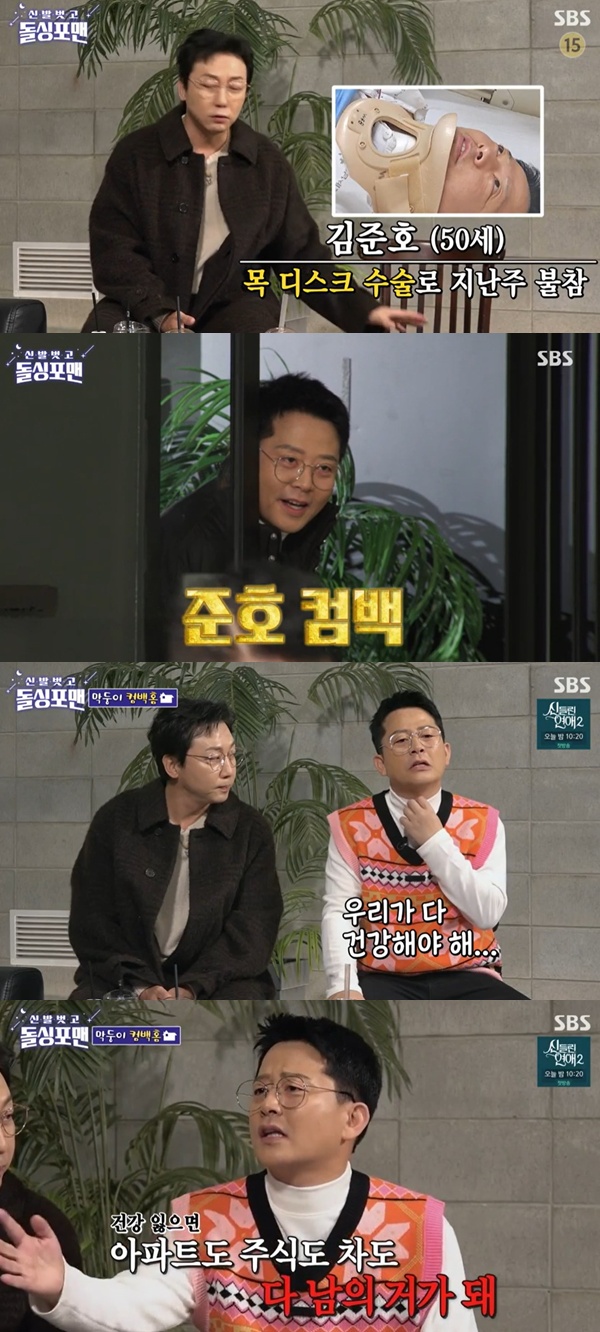 [스포츠투데이 임시령 기자] '신발 벗고 돌싱포맨' 김준호가 목 디스크 수술을 마치고 복귀했다.