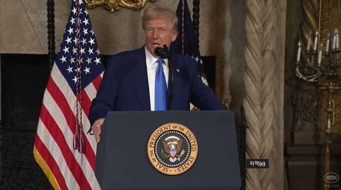 트럼프 대통령이 플로리다주 마러라고 자택에서 행정명령 서명식을 개최한 후 기자들 질문에 답하고 있다. 워싱턴=뉴시스 |