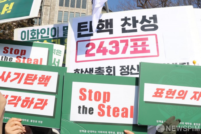 [서울=뉴스핌] 양윤모 기자 = 윤석열 대통령 탄핵 반대를 주장하는 이화여대 학생의 시국선언 행사와 탄핵을 주장하는 집회가 26일 오전 이대 대강당 앞 계단에서 개최 되었다. 2025.02.26 yym58@newspim.com
