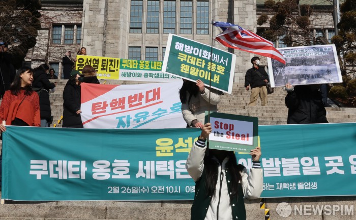[서울=뉴스핌] 양윤모 기자 = 윤석열 대통령 탄핵 반대를 주장하는 이화여대 학생의 시국선언 행사와 탄핵을 주장하는 집회가 26일 오전 이대 대강당 앞 계단에서 개최 되었다. 2025.02.26 yym58@newspim.com