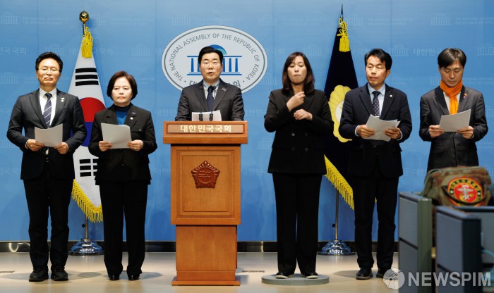 [서울=뉴스핌] 윤창빈 기자 = 박찬대 더불어민주당 원내대표가 26일 오후 서울 여의도 국회 소통관에서 열린 명태균 특검 촉구 야6당 원내대표 기자회견에서 기자회견문을 발표를 하고 있다. 이날 기자회견에는 박 원내대표, 정춘생 조국혁신당 원내수석부대표, 윤종오 진보당 원내대표, 한창민 사회민주당 대표가 참석했다. 2025.02.26 pangbin@newspim.com