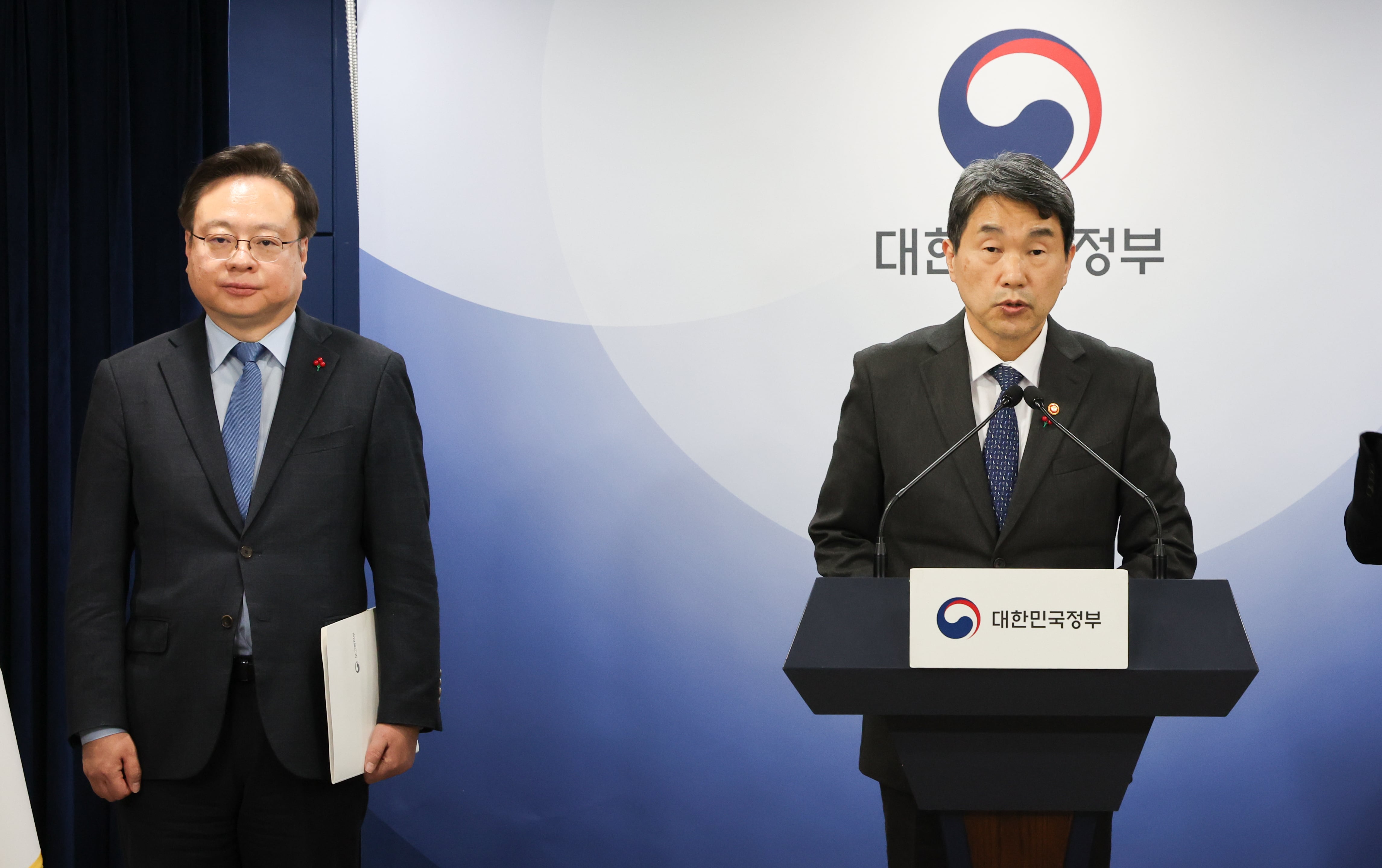 이주호 사회부총리 겸 교육부장관(오른쪽)과 조규홍 보건복지부장관이 1월 10일 서울 종로구 정부서울청사에서 의료계와 의학교육계에 드리는 말씀을 하고 있다. /뉴스1 |