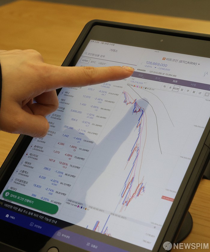 [서울=뉴스핌] 이호형 기자 = 상승 동력을 잃은 가상화폐 대장주 비트코인이 9만 달러선이 무너진 가운데 26일 오후 서울 강남구 업비트 라운지 내 태플릿에 비트코인 시세가 표시되고 있다. 한편 비트코인 가격이 9만 달러선 아래로 떨어진 것은 작년 11월 중순 이후 3개월여만이다. 2025.02.26 leemario@newspim.com |