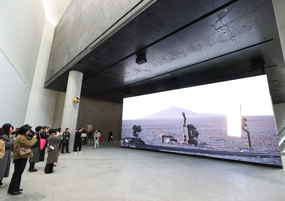 위그의 작품은 이렇듯 시시각각 진화한다. 전시 동선상 가장 마지막에 있는 대형 영상 작품 '카마타' 역시 전시 공간 안의 온도, 습도, 소음 등의 정보를 수집하고, 이를 토대로 화면에 송출되는 이미지를 실시간 편집해 보여준다. 스크린 맞은편 기둥에 달린 금색 구가 센서다. 새로운 이미지를 계속해서 펼쳐내니 영상엔 시작과 끝이 없다. 그 내용도 심오하다. 지구상 가장 오래되고 건조하다는 칠레 아타카마 사막에 놓인 해골과 그 주변을 둘러싼 로봇 팔들의 불가사의한 의식을 비춘다. 생명 없이 남겨진 인간의 유해와 움직이는 기계가 빚어내는 장면은 마치 인간 멸종 이후의 세계 혹은 인간과 기계의 새로운 관계 등을 암시하는 듯하다.