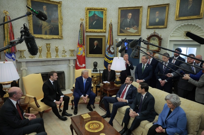24일(현지시간) 백악관 집무실에서 도널드 트럼프 미국 대통령과 에마뉘엘 마크롱 프랑스 대통령이 기자들의 질문에 대답하고 있다./AFPBBNews=뉴스1 |
