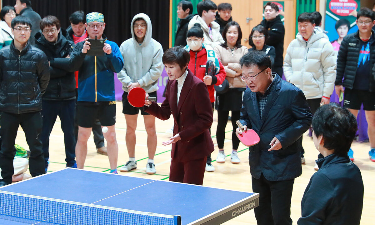 울진군은 ‘제5회 현정화와 함께하는 울진대게 전국 오픈 탁구대회’를 오는 28일부터 3월 2일까지 울진군민체육관 및 울진국민체육센터 다목적 체육관에서 개최하는 가운데 현정화 감독과 손병복 군수가 탁구 시범 경기를 펼치고 있다. 울진군 제공 |