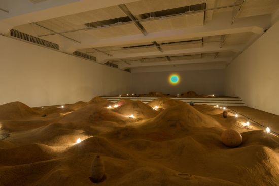 1층 1전시실에서는 거대한 지형 조형인 ‘솔라리스’가 설치됐다. 스타니스와프 렘의 소설 ‘솔라리스’를 차용한 해당 전시는 일본의 사찰 도다이지(東大寺)와 미래 시점 어느 행성을 포개어 선보인다. 솔라리스 소설에서 모티브를 얻어 어딘가 존재할 법한 미지 공간에서 타인과 조우하는 내용을 표현했다. 코르크, 황토 분말, 테라코타 가루, 부표 등을 사용해 봉분, 사막, 강호, 분지를 형성했다. 임 작가는 “자연이지만 자연처럼 느껴지지 않고 언젠가 소멸할 것이지만 그 역사를 상상하기 어려운 세계에 착안했다”고 설명했다.