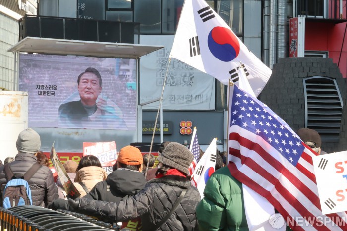 [서울=뉴스핌] 양윤모 기자 = 윤석열 대통령 탄핵을 반대하는 '자유와정의를실천하는교수모임'(자교모) 회원들이 27일 오전 서울 중구 중국대사관 인근 포스트타워 앞에서 집회를 하고 있다. 2025.02.27 yym58@newspim.com