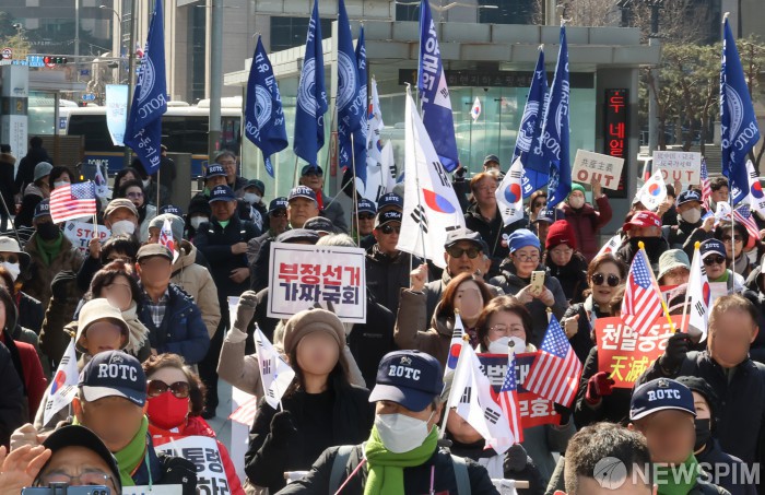 [서울=뉴스핌] 양윤모 기자 = 윤석열 대통령 탄핵을 반대하는 '자유와정의를실천하는교수모임'(자교모) 회원들이 27일 오전 서울 중구 중국대사관 인근 포스트타워 앞에서 집회를 하고 있다. 2025.02.27 yym58@newspim.com