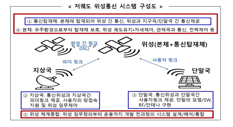 이번 저궤도 위성통신 기술개발 사업은 저궤도 통신위성(2기)과 지상국·단말국으로 구성된 저궤도 위성통신 시스템 1식 개발을 목표로 한다. 위성과 지상간, 위성과 위성간 통신기능을 수행하는 △통신탑재체 △지상국 △단말국 △본체 △위성 체계종합 등을 개발할 예정이다.