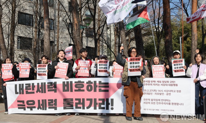 이들은 27일 서강대 정문 인근에서 기자회견을 열고 "최근 민주주의 투쟁의 장이었던 대학까지 내란을 옹호하고 윤 대통령을 비호하는 세력들이 들이닥쳐 계엄을 정당화하고 가짜 뉴스를 선동하고 있다"며 "1970년대, 1980년대 민주화와 투쟁의 역사가 있는 서강대학교를 극우 폭도들이 훼손시키게 둘 수 없다"고 강조했다.