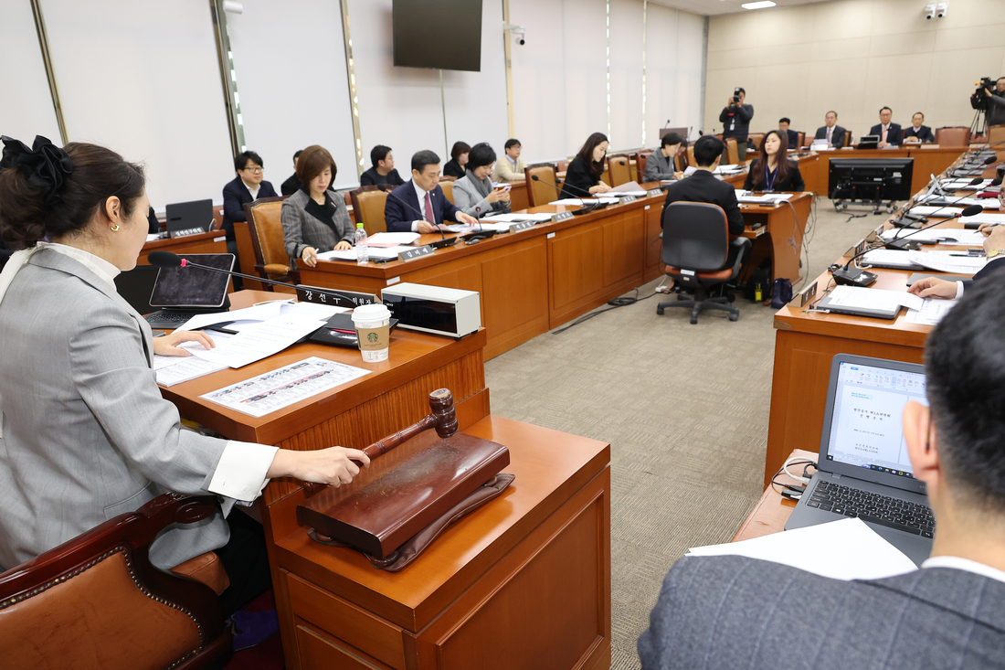 27일 국회에서 열린 보건복지위원회 법안심사제1소위원회에서 더불어민주당 소속 강선우 소위원장이 의사봉을 두드리고 있다./연합뉴스 |