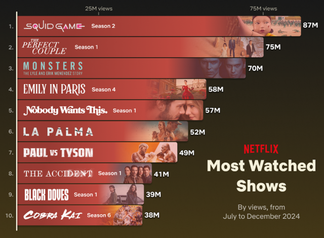 특히 지난해 12월 26일 공개된 오징어게임 시즌2는 연말을 단 6일 앞두고 공개됐음에도 약 8700만 시청 수(전체 시청 시간 나누기 전체 러닝타임)를 기록하며 하반기 가장 많이 본 시리즈에 등극했다.