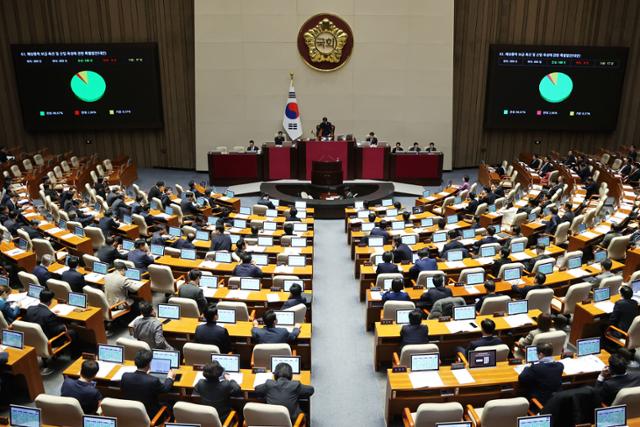 27일 오후 서울 여의도 국회에서 열린 제422회 국회(임시회) 제7차 본회의에서 해상풍력 보급 촉진 및 산업육성에 관한 특별법안이 통과되고 있다. 뉴시스 |