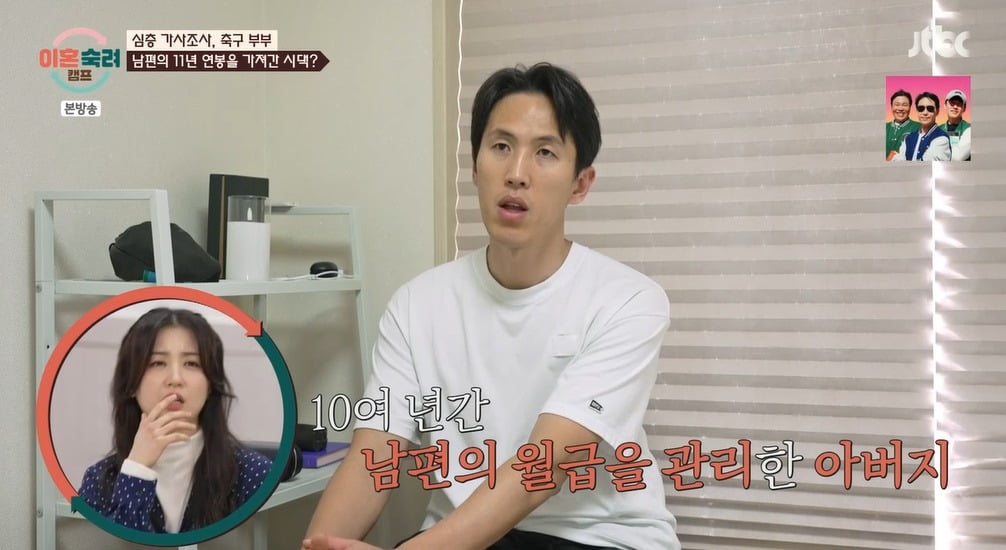 결혼 전에 남편의 연봉은 세후 5억 이상이었다고. 남편은 "아빠가 너는 운동에만 전념하라고 제 월급을 10년간 대신 관리를 하셨다. 제 통장이 아빠한테 있었고, 아빠가 용돈을 보내주는 식이었다"고 말했다. 이를 들은 운동선수 출신 MC 서장훈은 "부모가 거의 선수의 매니저처럼 산다. (축구 부부) 이런 케이스가 많긴 하고, 저도 그랬다"며 흔한 사례라 덧붙였다.