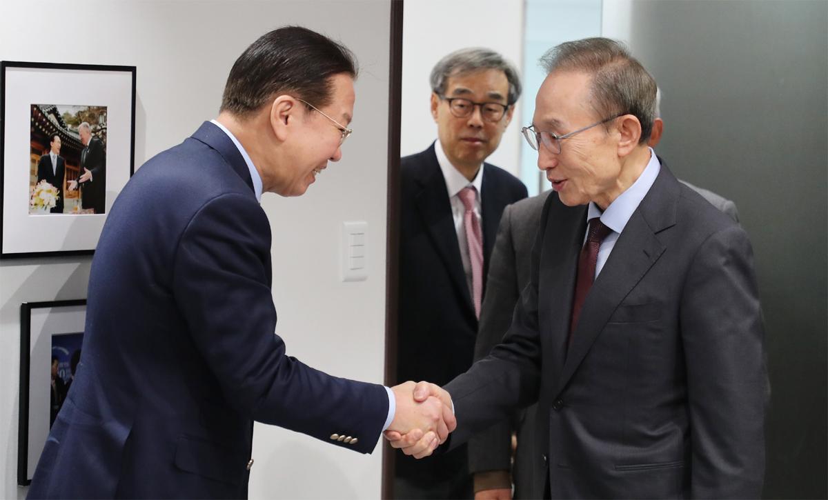 국민의힘 권영세 비상대책위원장(왼쪽)이 27일 서울 서초구 청계재단에서 이명박 전 대통령을 예방해 악수를 하고 있다. 이 전 대통령은 이날 “요즘 당을 볼 때 우리 보수 정당이 생긴 이후 가장 어려울 때 같다”며 “다수가 힘을 모으니 그게 무섭지 않나. 집권당이고, 소수라도 힘만 모으면 해 나갈 수 있다”고 말했다.