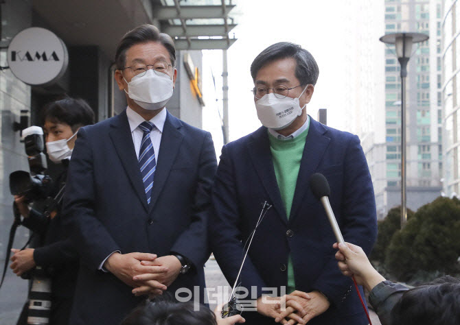 지난 2022년 대선후보 단일화를 위한 회동을 마친 이재명 더불어민주당 대선 후보와 김동연 새로운물결 대선 후보가 취재진의 질문에 답하고 있다.(사진=연합뉴스) |