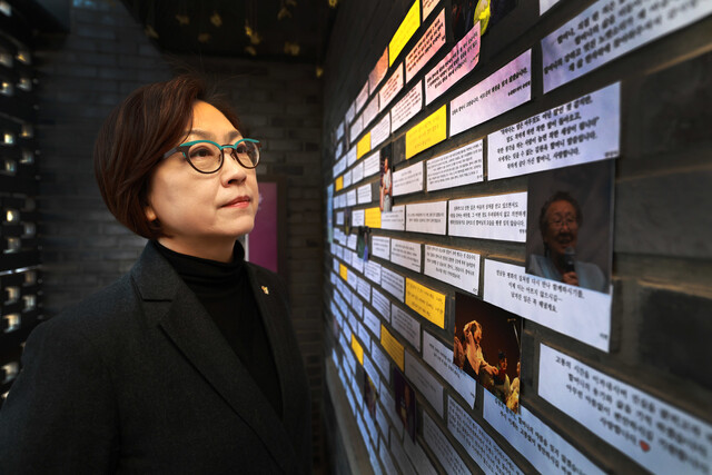 이나영 정의기억연대 이사장이 지난 24일 서울 마포구 전쟁과여성인권박물관에 마련된 ‘위안부’ 피해자 추모관에서 최근 별세한 길원옥 할머니 추모 공간을 바라보고 있다. 정용일 선임기자 yongil@hani.co.kr |