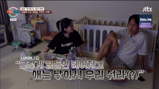아내는 시어머니가 했던 상처에 대해 언급하기도. 아내는 시어머니가 “그렇게 힘들면 헤어지고 애는 낳아서 우리 줘라”라고 말했다는 것을 밝혀 모두를 놀라게 만들었다.