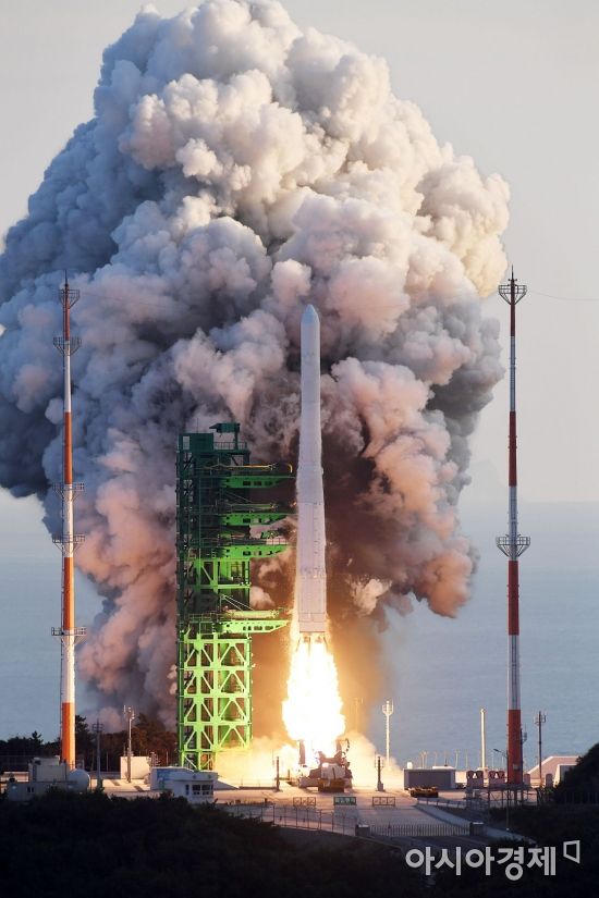한국형 발사체 누리호(KSLV-ll)가 고흥군 나로우주센터 제2발사대에서 화염을 내뿜으며 힘차게 날아오르고 있다. 고흥=사진공동취재단 |