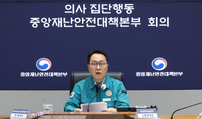 박민수 보건복지부 2차관이 28일 서울 종로구 정부서울청사 상황실에서 열린 의사 집단행동 중앙재난안전대책본부 회의에서 발언하고 있다. /연합 |