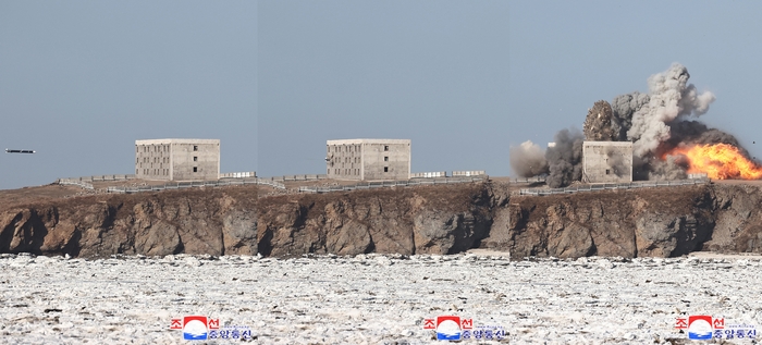 북한이 지난 26일 오전 전략순항미사일 발사훈련을 진행했다고 조선중앙통신이 28일 보도했다. 통신은 김정은 국무위원장이 훈련을 참관했다고 보도했다. 사진은 순항미사일이 콘크리트 구조물(모의표적)을 정밀 타격하는 모습. [조선중앙통신·연합뉴스] |