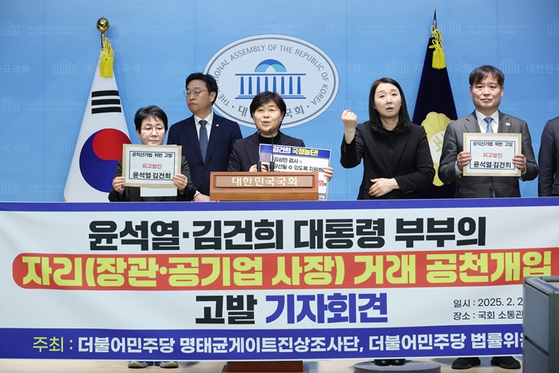 민주당 명태균게이트 진상조사단과 법률위원회는 오늘(28일) 서울 여의도 국회 소통관에서 기자회견을 열고 "대통령 부인 김건희가 장관과 공기업 사장직의 인사권을 쥐고 있는 대통령의 지위를 이용해 공천에 개입하고 선거에 개입하고 인사에 개입해 대한민국 국민을 우롱했다"며 이같이 밝혔습니다.