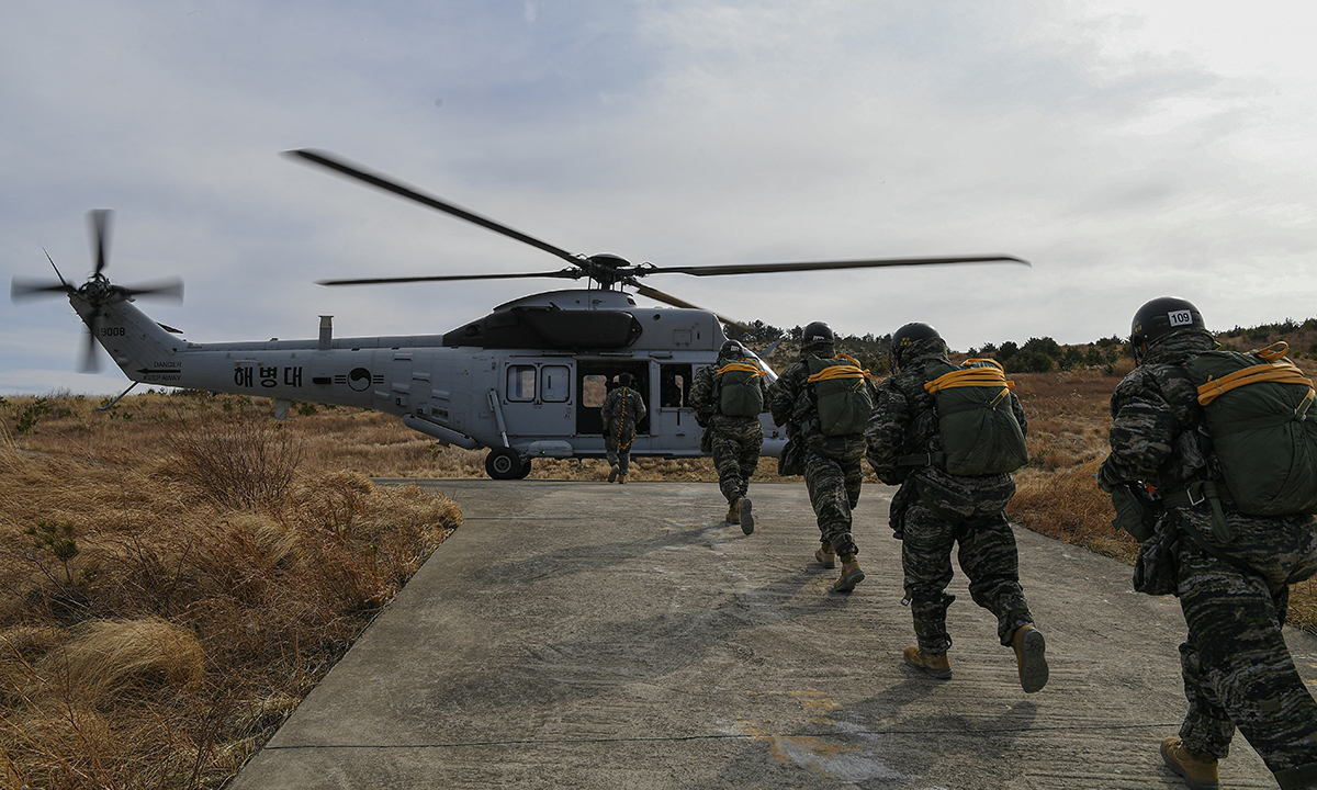 경북 포항시 조사리 공정훈련장에서 공수기본 266차 교육생들이 강하훈련을 위해 상륙기동헬기 마린온에 탑승하고 있다. |