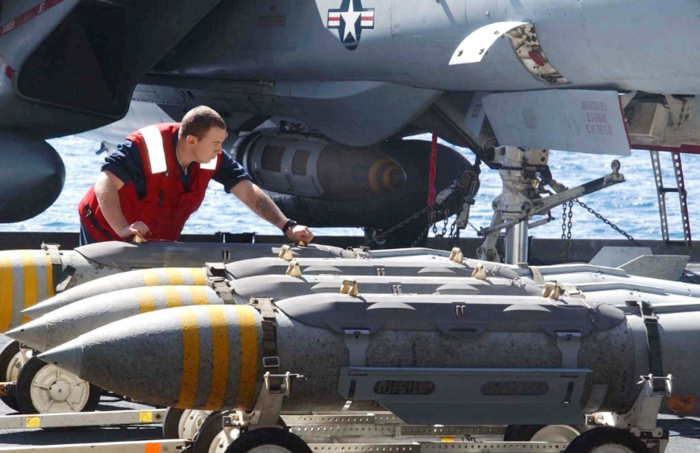 2002년 미 항공모함 존 F. 케네디호 갑판의 F-14 톰캣 전투기 옆에서 2천 파운드급 항공폭탄인 MK-84를 옮기는 미군 병사들 [사진 출처 = 로이터 연합뉴스] |