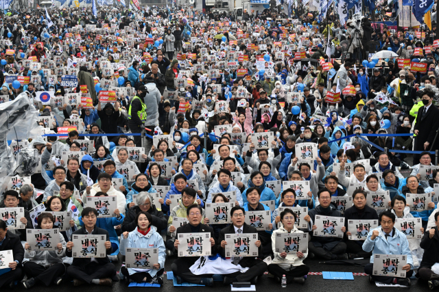 이재명 더불어민주당 대표, 박찬대 더불어민주당 원내대표, 김선민 조국 혁신당 대표 권한대행, 김재연 진보당 상임대표, 한창민 사회민주당 대표를 비롯한 '야5당 공동 내란종식·민주헌정수호를 위한 윤석열 파면 촉구 범국민대회' 참가자들이 삼일절인 1일 서울 종로구 안국역 인근에서 손팻말을 들어 올리고 있다.