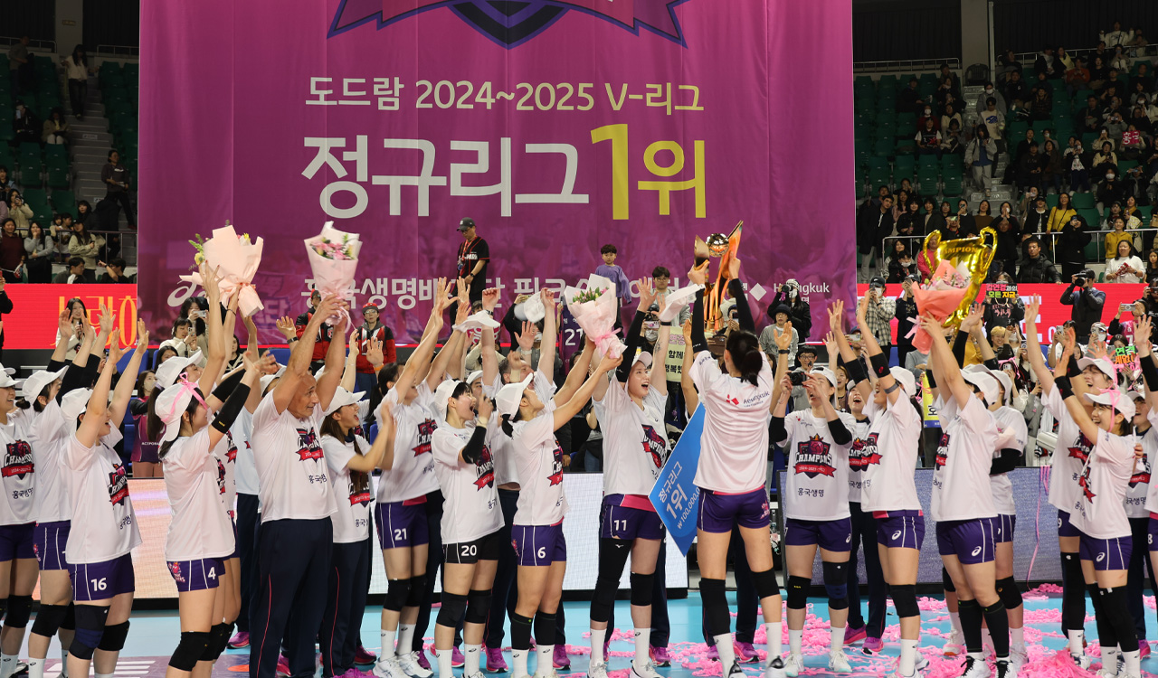 한국배구연맹이 대전 충무체육관에서 열린 프로배구 도드람 2024-2025 V리그 정관장과 흥국생명의 경기가 끝난 뒤, 정규리그 여자부 1위 시상식을 열었습니다.